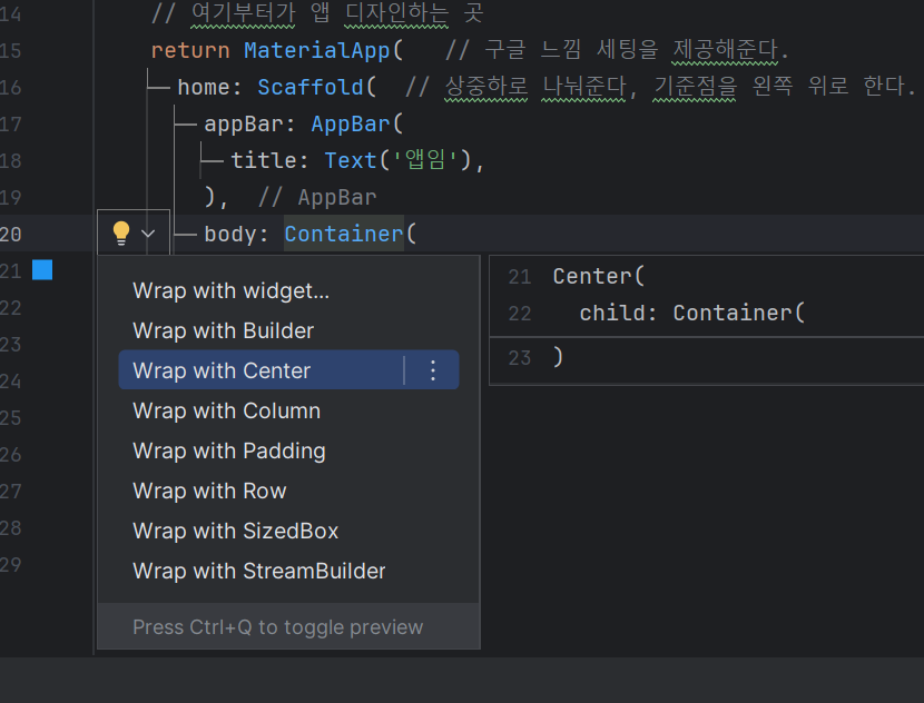 Widget build(BuildContext context) { // 여기 위에 4줄은 형식적인 것들임