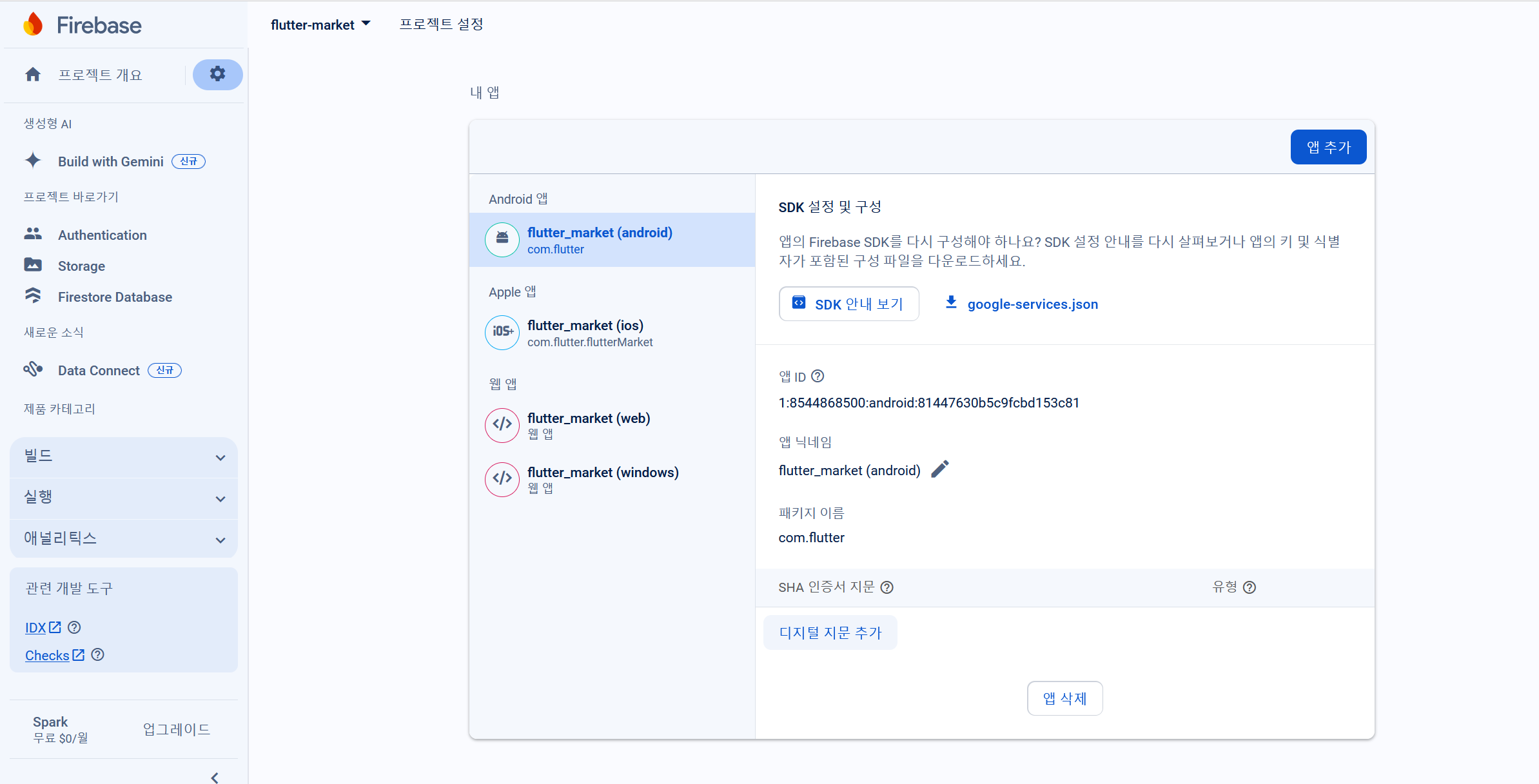 파이어베이스로 들어와서 프로젝트 설정을 보자.