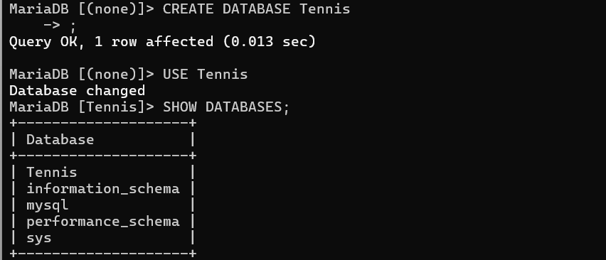 만들땐 create database tennis이다.