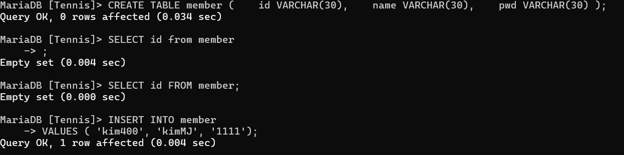 tennis 란 데이터베이스를 만들자