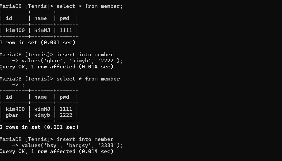 1) mariadb가 있는 컨테이너 접속 : docker exec -it mariadb /bin/bash