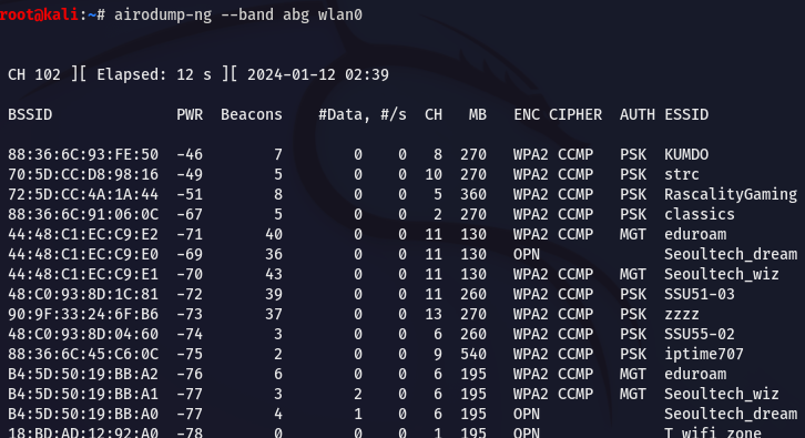 airodump-ng --band abg wlan0 으로 2.4뿐만 아니라 5Ghz 대역까지 잡을 수 있다.