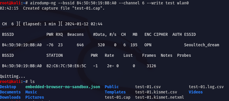 airodump-ng 이후 bssid를 통해 고르고 채널을 6으로 선택, 다된 파일을 test란 이름으로 저장한다.