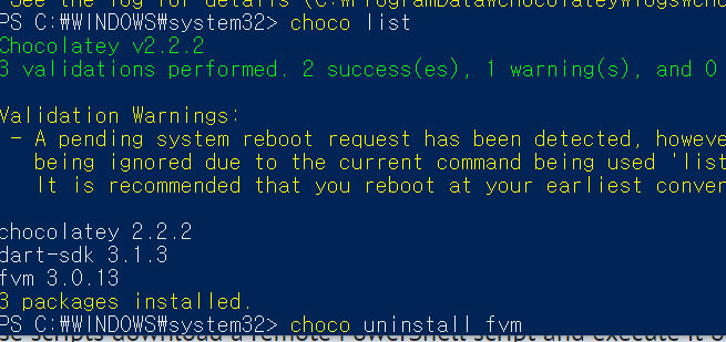 choco uninstall fvm으로 choco를 삭제한다.